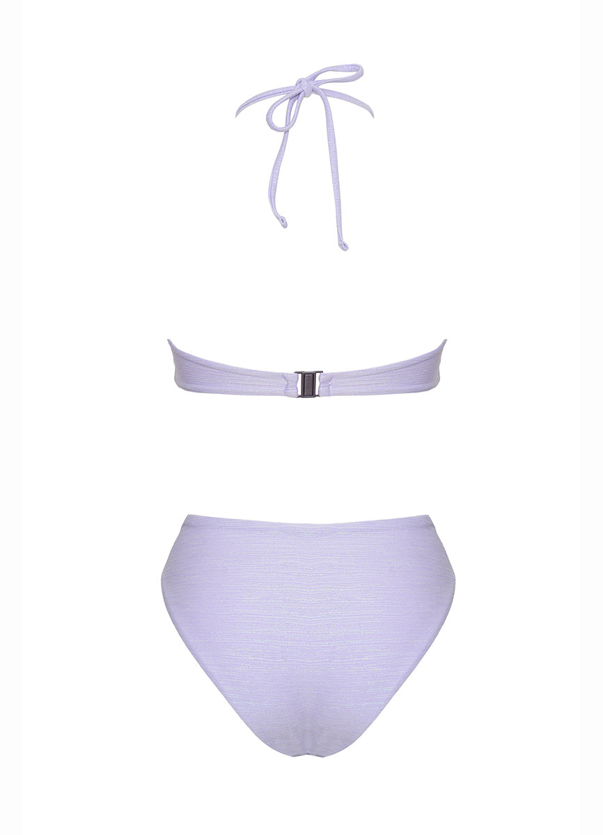 Traje de baño de una pieza en tela brillante. Argolla en el centro del cuello con detalle escrito de Alma Arena.