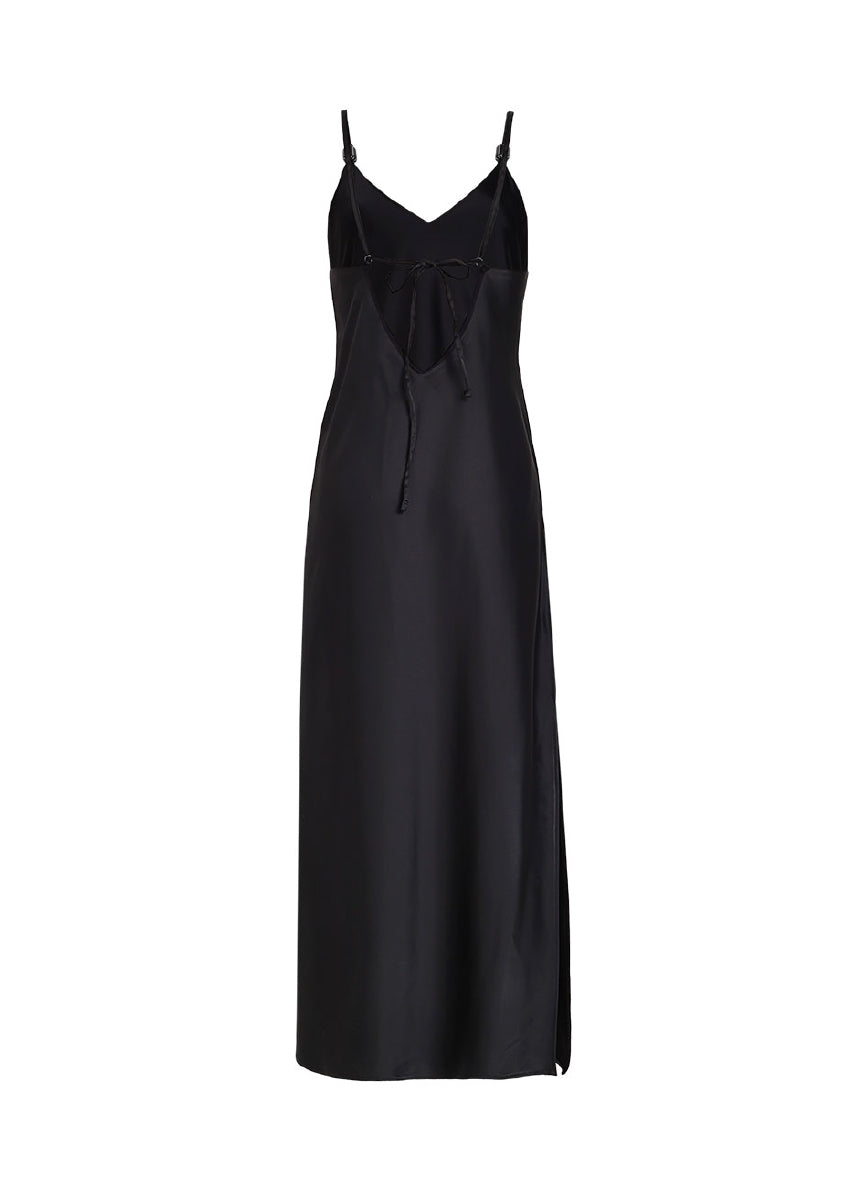 El Vestido Aurelia tiene una silueta tipo slip, con escote profundo en la espalda, cargaderas ajustables y una abertura lateral que aporta movimiento. Confeccionado en nuestra tela negra brillante, cae suavemente sobre el cuerpo con un acabado fluido y elegante. Pensado para atardeceres cálidos y noches de verano, es un básico atemporal que siempre resalta.