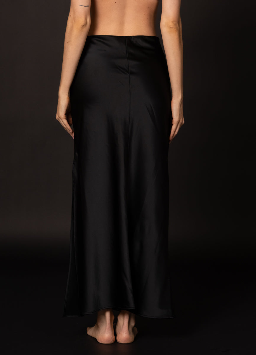 La Falda Reva tiene una silueta recta con abertura frontal y cordón ajustable en la cintura, decorado con gems aplicadas a mano. Confeccionada en nuestra tela negra brillante, mezcla estructura y fluidez para lograr un look limpio y cómodo. Una prenda refinada para llevar del mar a la noche.