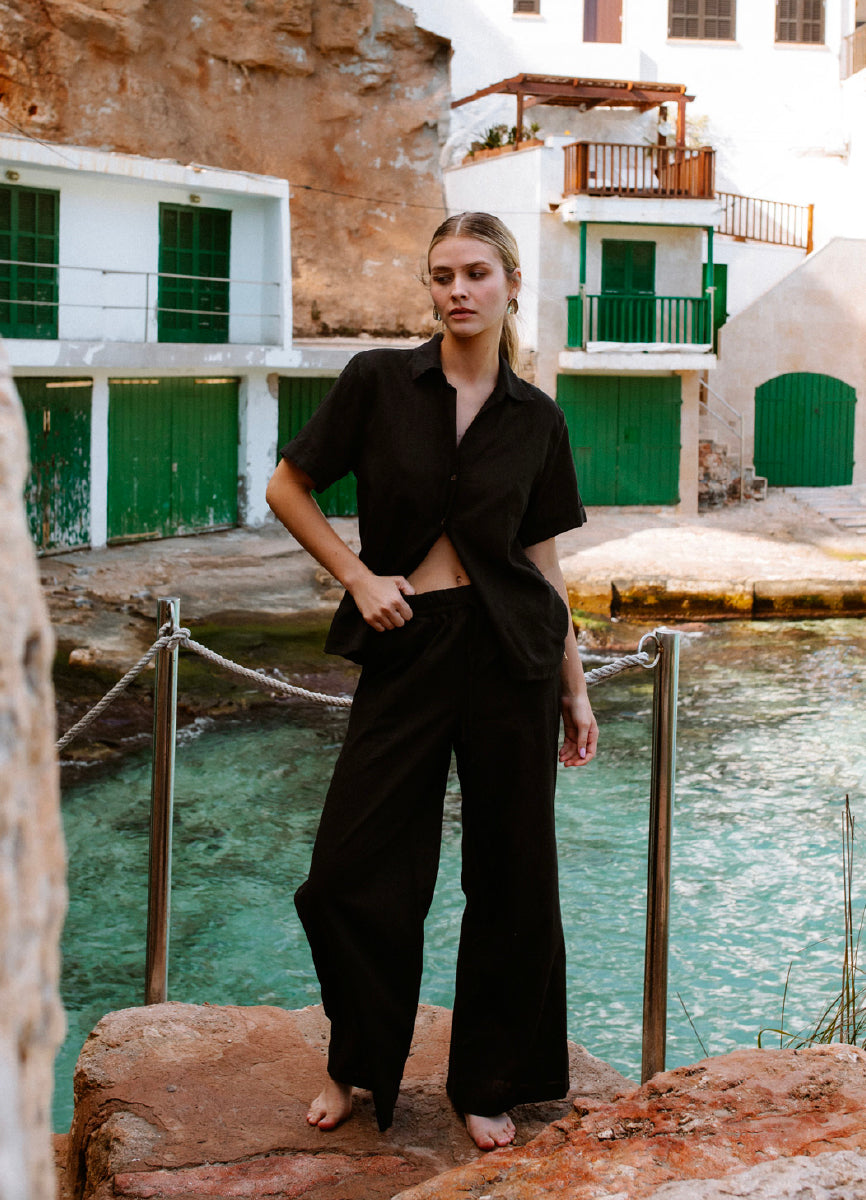 Pantalón de corte ancho con bolsillos laterales y cintura elástica, confeccionado en algodón con efecto lino, que combina comodidad, frescura y un ajuste perfecto.