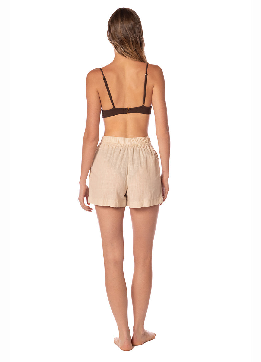 Short con cintura elástica y bolsillos confeccionados en algodón con efecto lino, ofreciendo un diseño cómodo y coordinado.