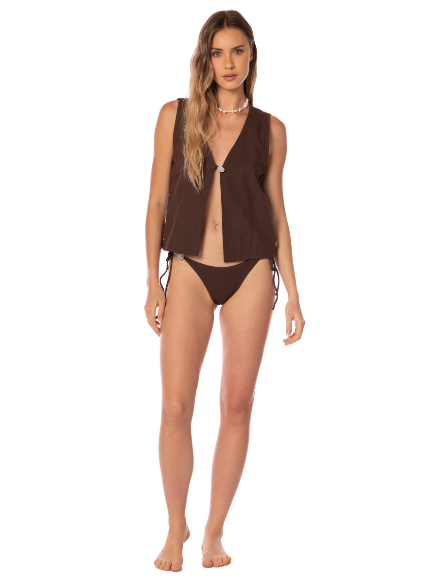 Una prenda versátil que redefine la elegancia sin esfuerzo, el Eternal Sands Eden Vest destaca por su tono chocolate intenso. Este chaleco sin mangas presenta un escote profundo en V y un cierre frontal con botón de piedra pulida, agregando un toque artesanal. Su tejido liviano y corte relajado lo hacen ideal para superponer sobre trajes de baño o lucirlo con un estilo casual-chic fuera de la playa.