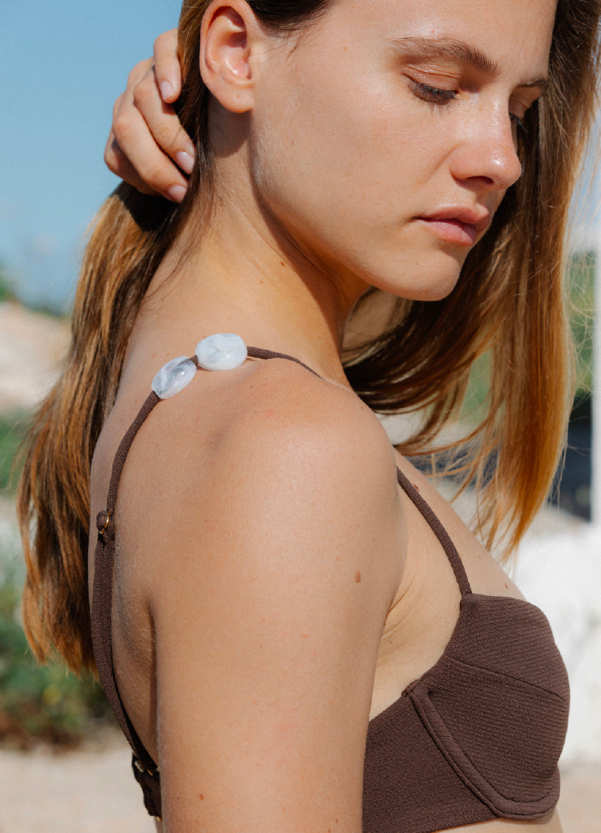 El top Fer en color sólido Eternal Sands está diseñado para brindar soporte y sofisticación con un estilo minimalista. Con copas estructuradas y varilla suave (sin relleno), proporciona una silueta favorecedora y cómoda. Sus tirantes ajustables y broche posterior garantizan un ajuste personalizado. El detalle de esferas decorativas en los tirantes le aporta un toque distintivo y elegante a esta pieza esencial de playa.