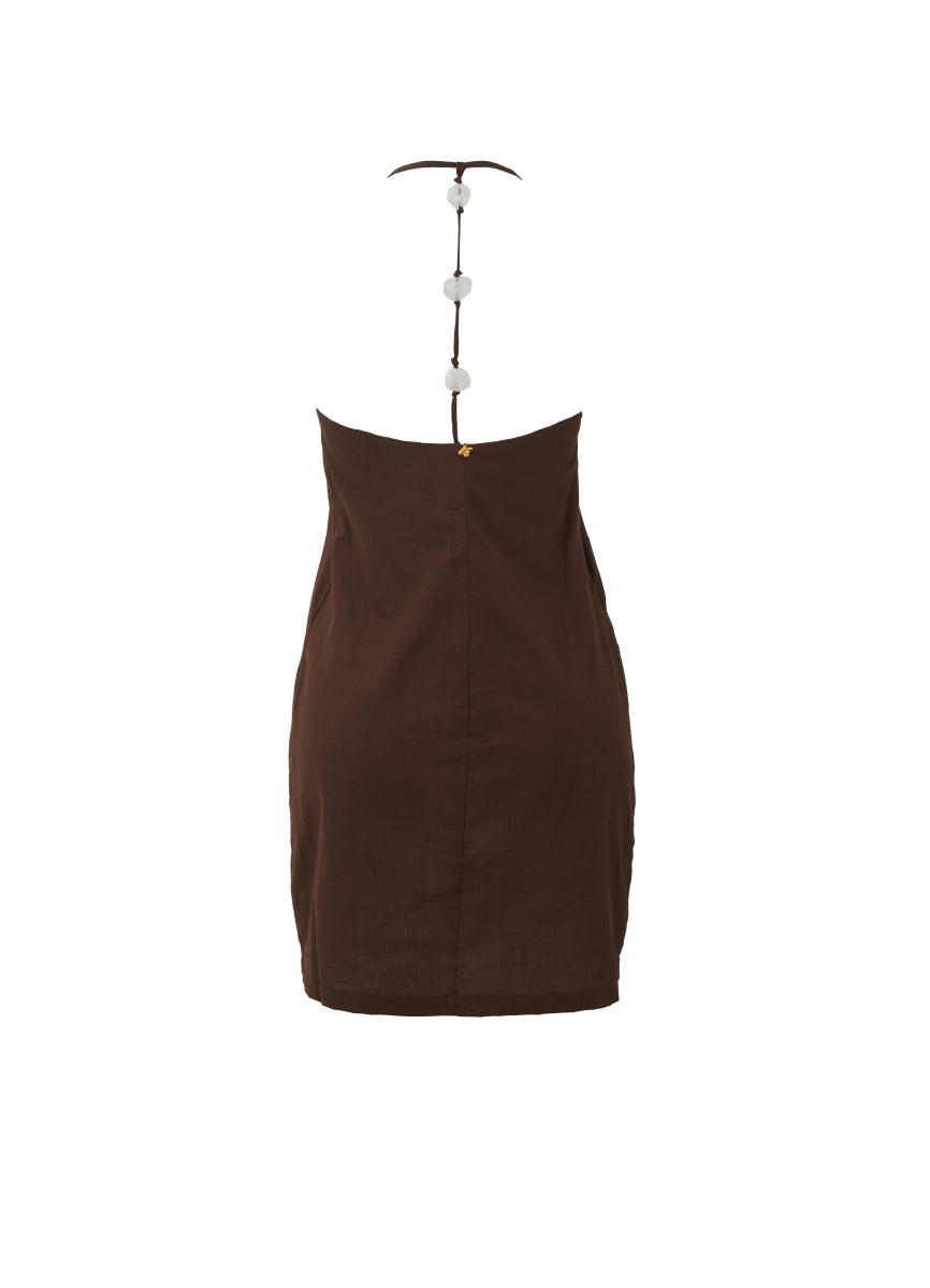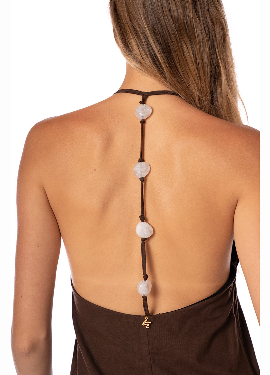 Minimalista y cautivador, el vestido Heli está diseñado para destacar. Su escote halter, abertura lateral y espalda descubierta con detalles de piedras lo hacen cómodo y sensual a la vez. Ideal para llevar sobre el traje de baño o usar solo en paseos bajo el sol.