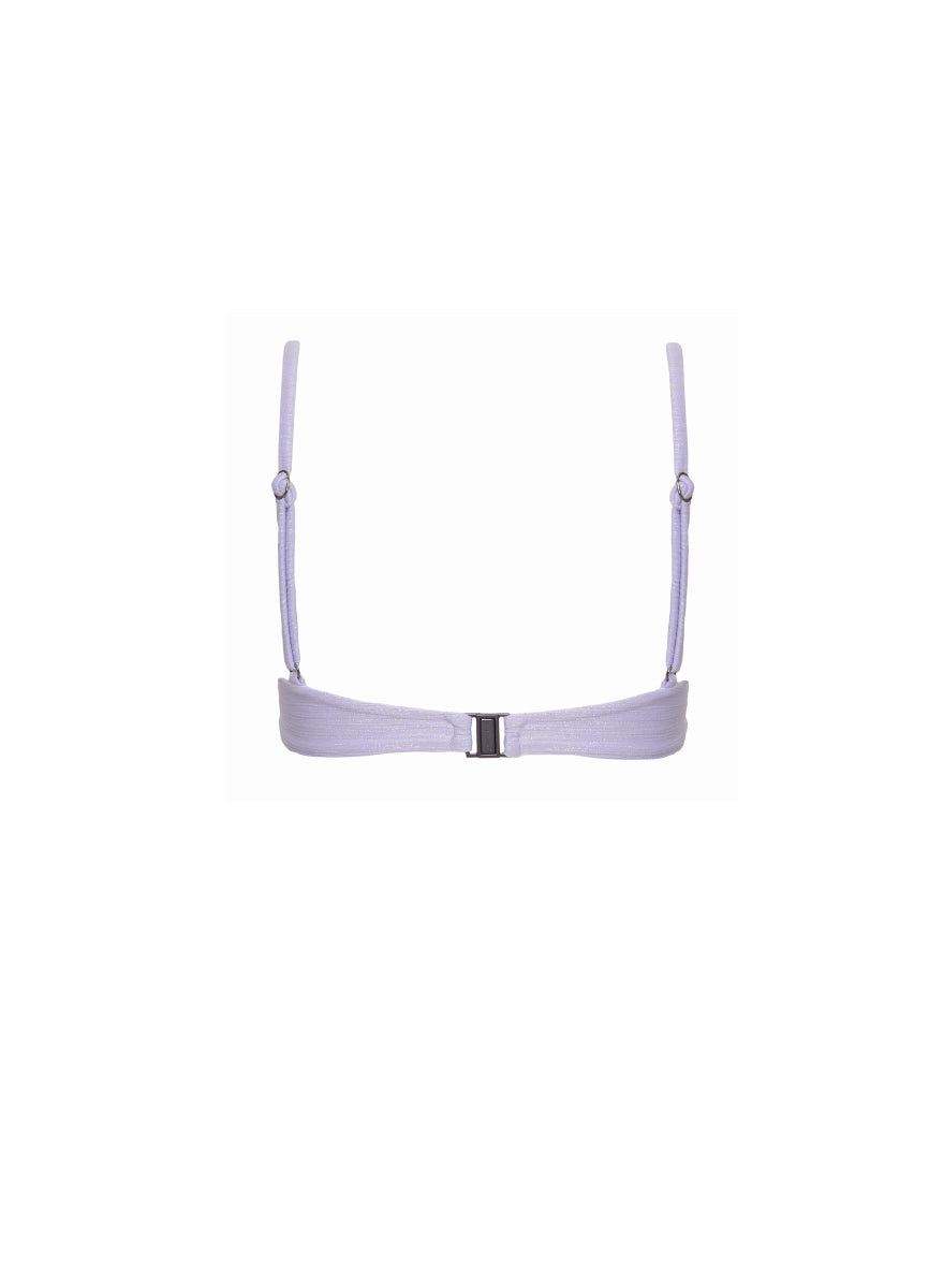 Top en tela brillante con detalle anudado, cargaderas ajustables y broche en la parte posterior.