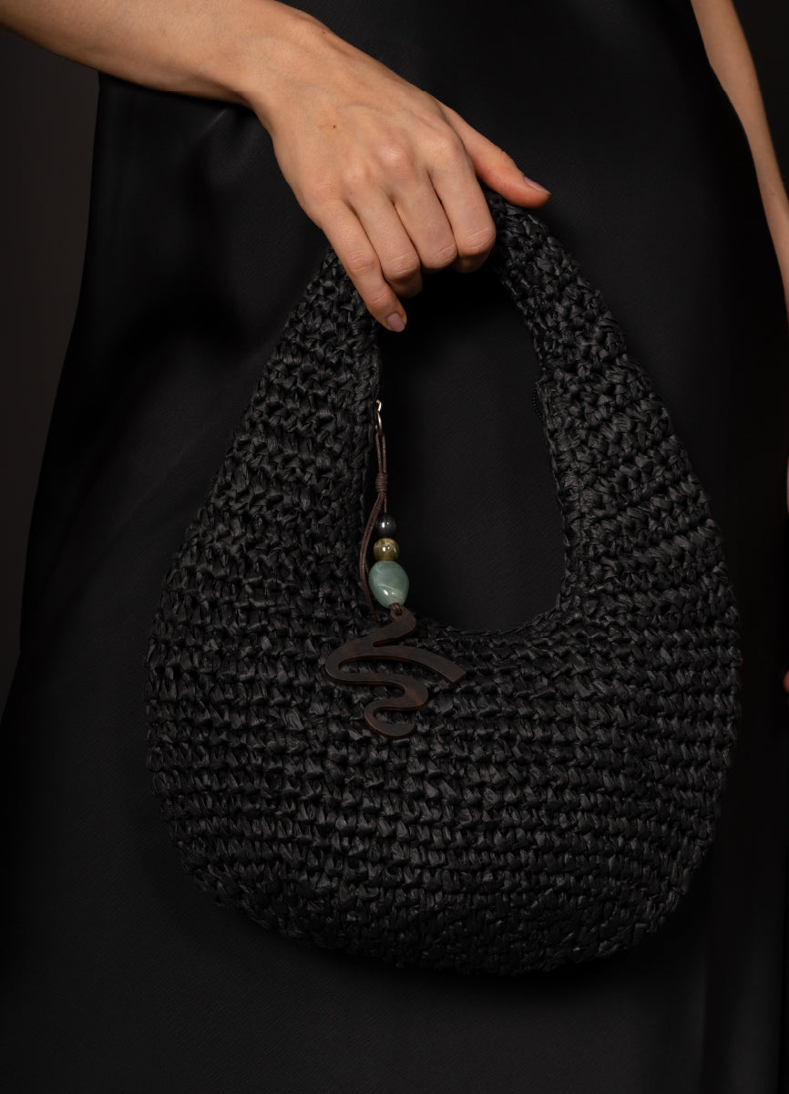 Tote bag liviano y texturizado en tejido oscuro, con forma redondeada y diseño moderno. Tiene dos asas fijas de diferentes largos y un charm metálico decorativo que le da un toque especial. Espacioso y práctico, es el complemento ideal para acompañarte a la playa o la piscina con estilo.