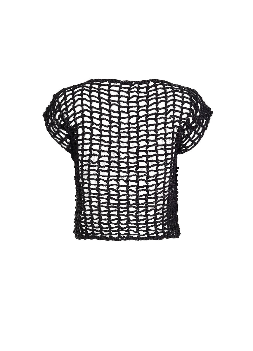 El Chaleco Sienna es una pieza tejida en crochet negro, con silueta abierta, cuello amplio y mangas cortas. Su diseño ligero y artesanal lo convierte en el complemento perfecto para llevar sobre vestidos de baño o prendas resort. Aporta textura y contraste a cualquier look de verano.