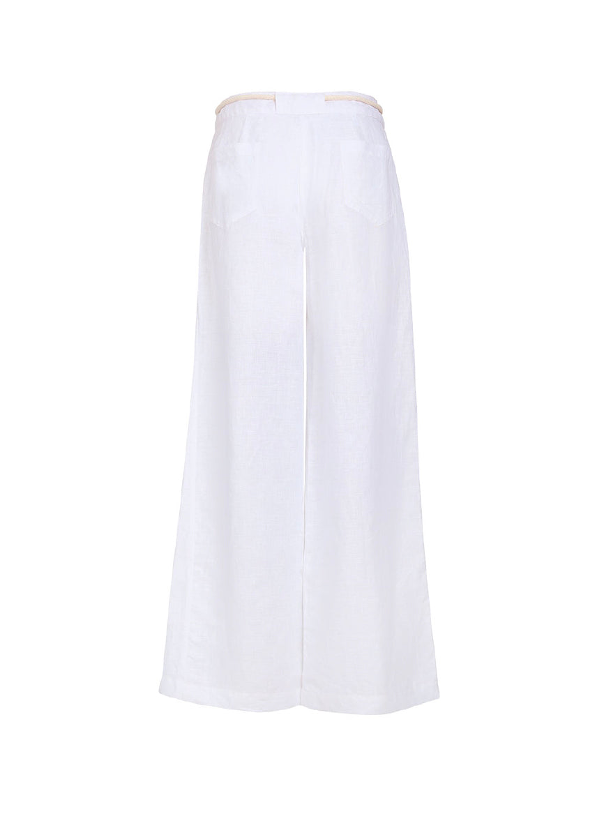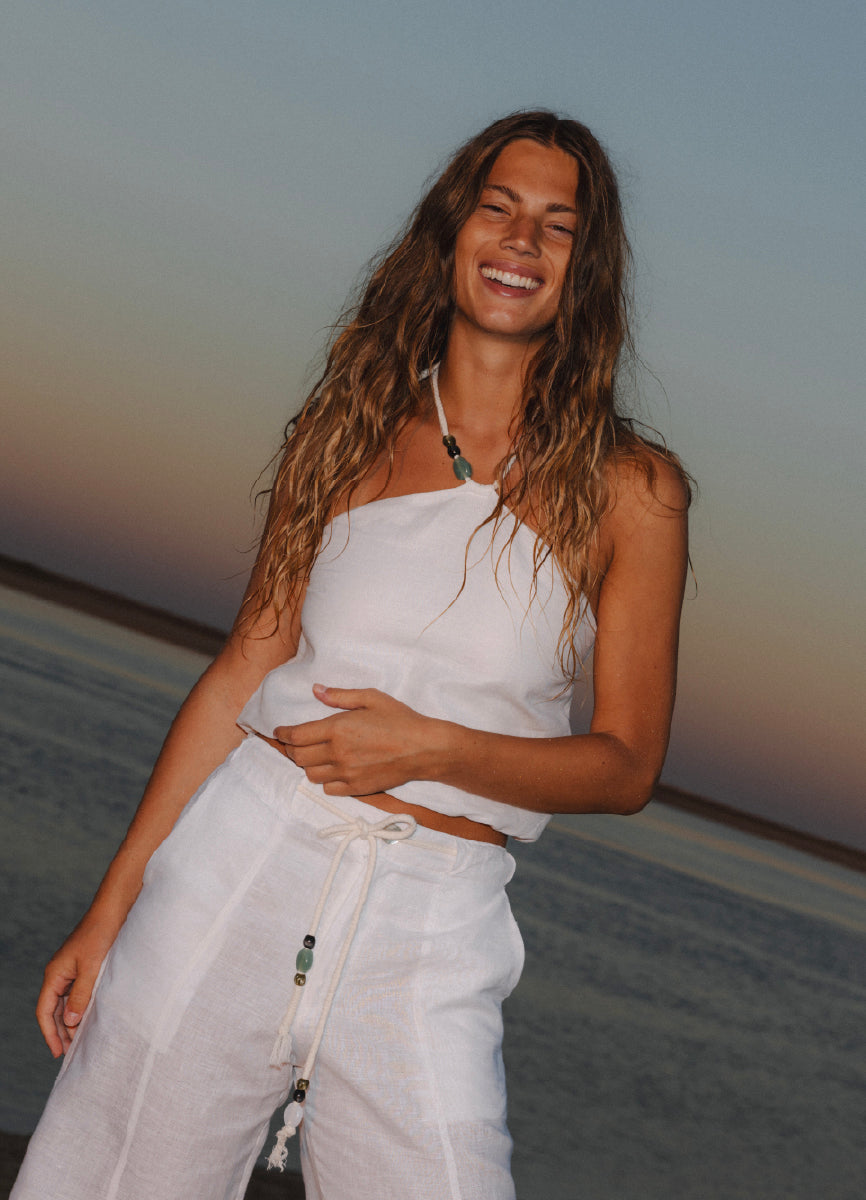 El Pantalón Arisha tiene una silueta amplia que combina estructura suave con movimiento natural. Lleva cordón frontal decorado con gems aplicadas a mano, que le aportan un detalle especial y sofisticado. Con bolsillos adelante y atrás, es una prenda versátil ideal para combinar con bikinis o tops resort y lograr un look de verano elevado sin esfuerzo.