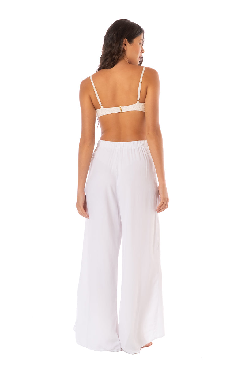 Pantalón cruzado con aberturas y botas anchas. De amarre en la cintura.