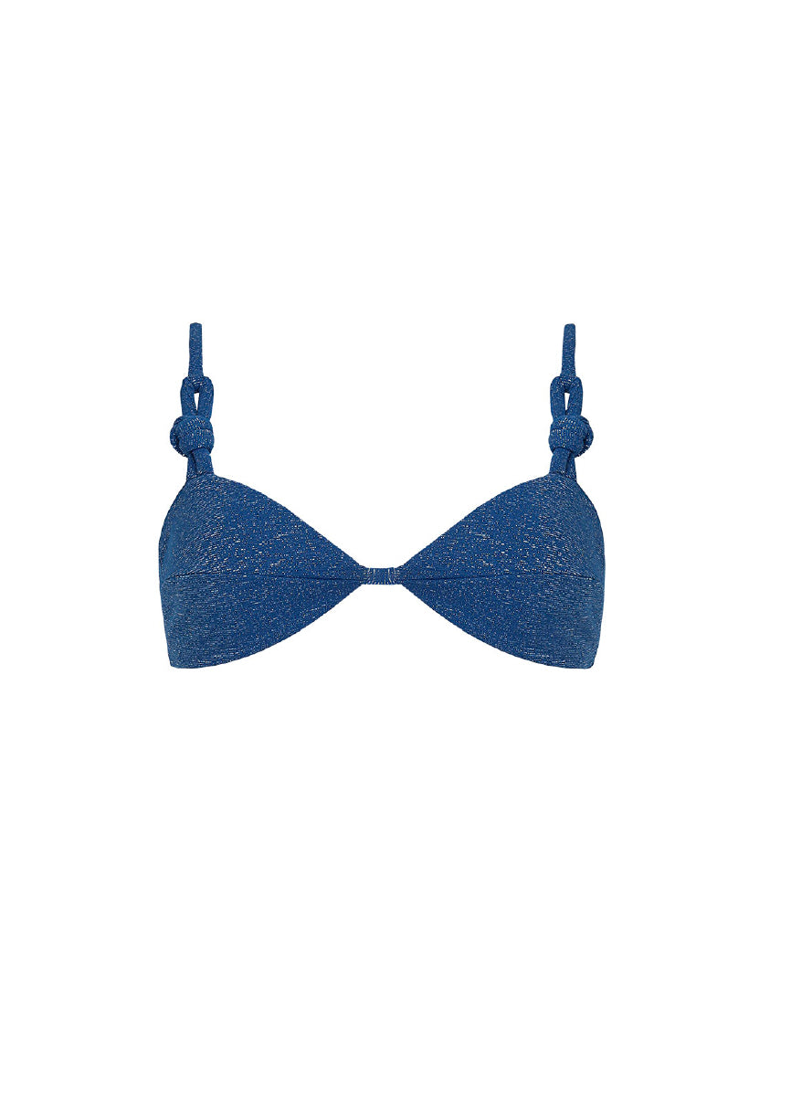Top especial tipo bralette escotado con corte. Viene con nudos chunky en las cargaderas y es elaborado en tela brillante. Cargaderas ajustables y broche en espalda.