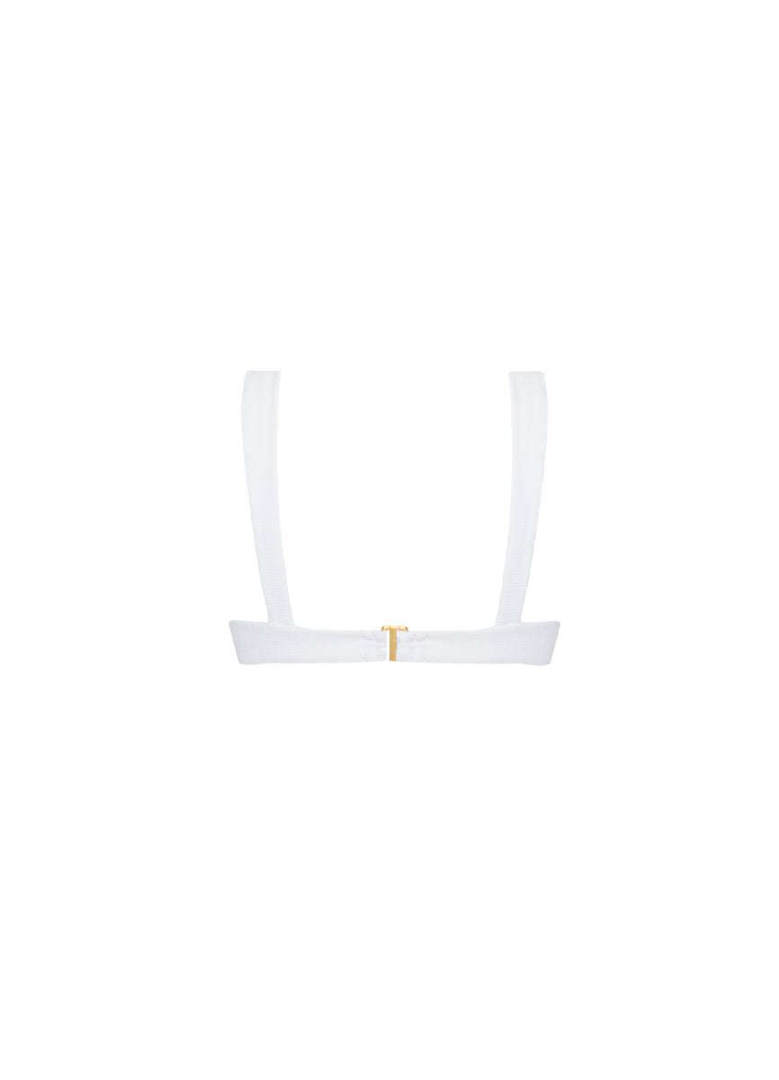 Top blanco con varilla en tela texturizada. Cargaderas anchas fijas y espada con broche y 2 posiciones.