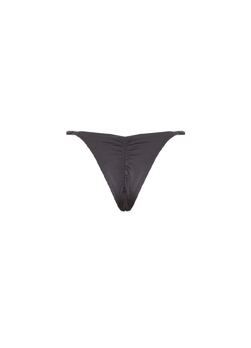 Panty con cobertura cheeky en tela brillante, ajustable en los laterales y detalle recogido posterior. Detalle de nudos con cordón plateado en los laterales.