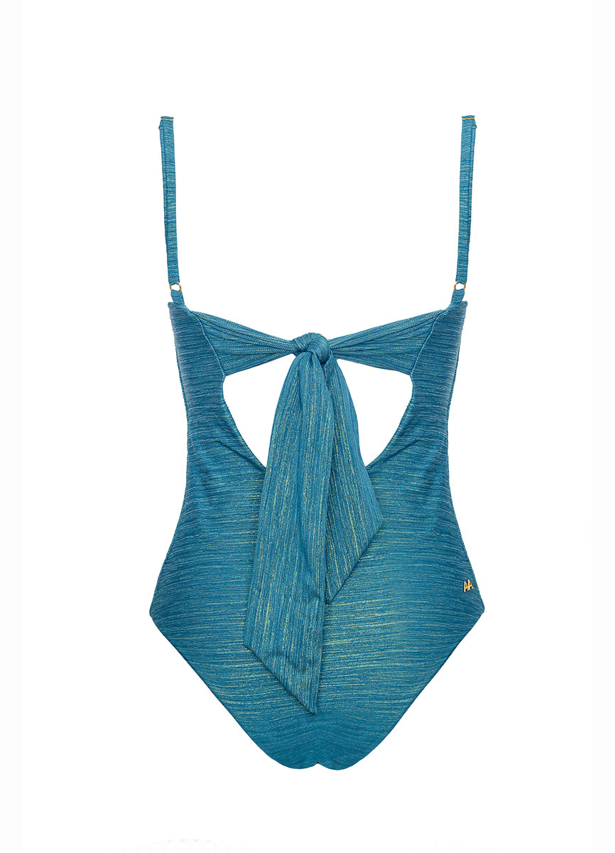 Traje de baño de una pieza con cortes en el centro. Tiene cargaderas ajustables y detalle de nudo en la espalda. Tela brillante.